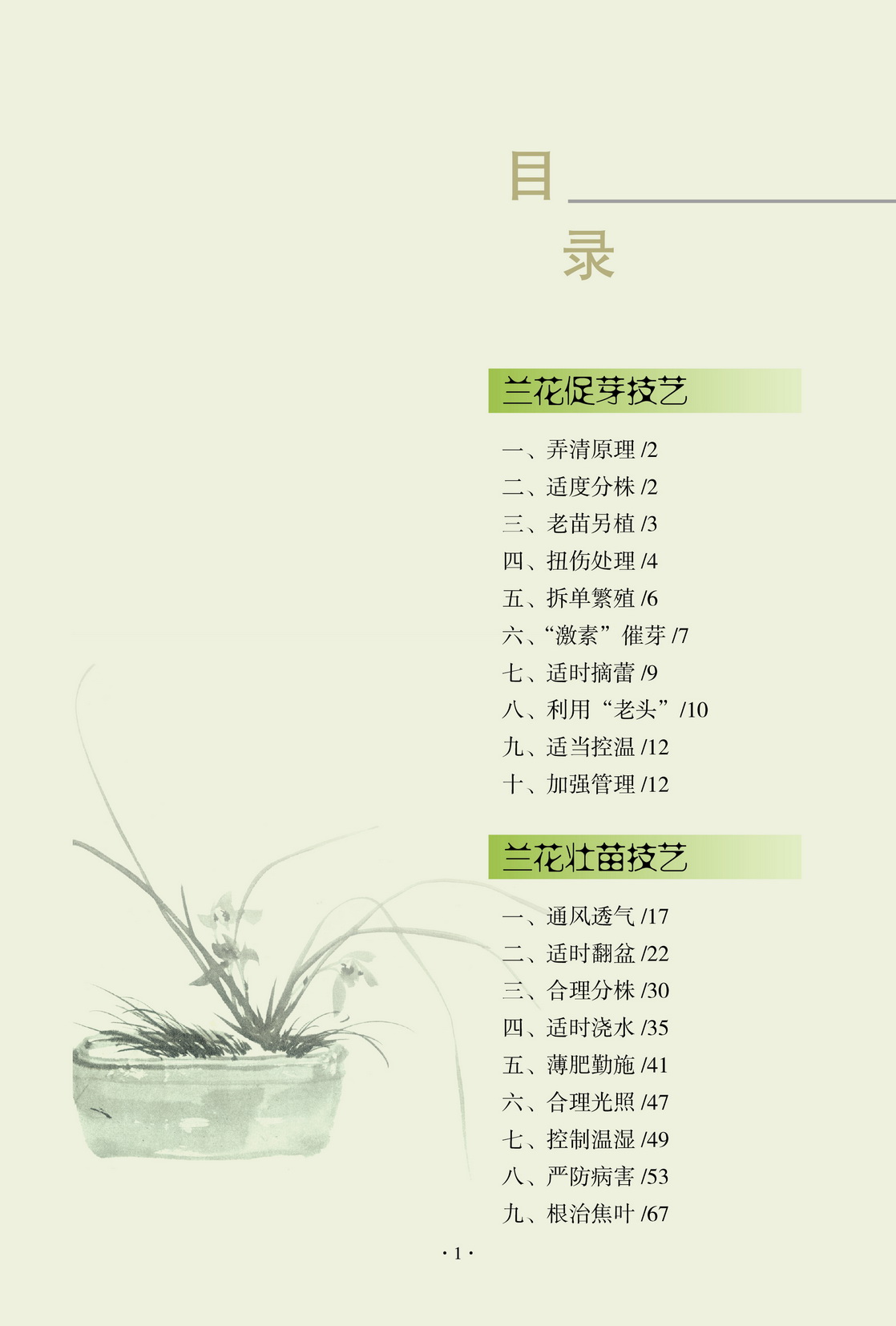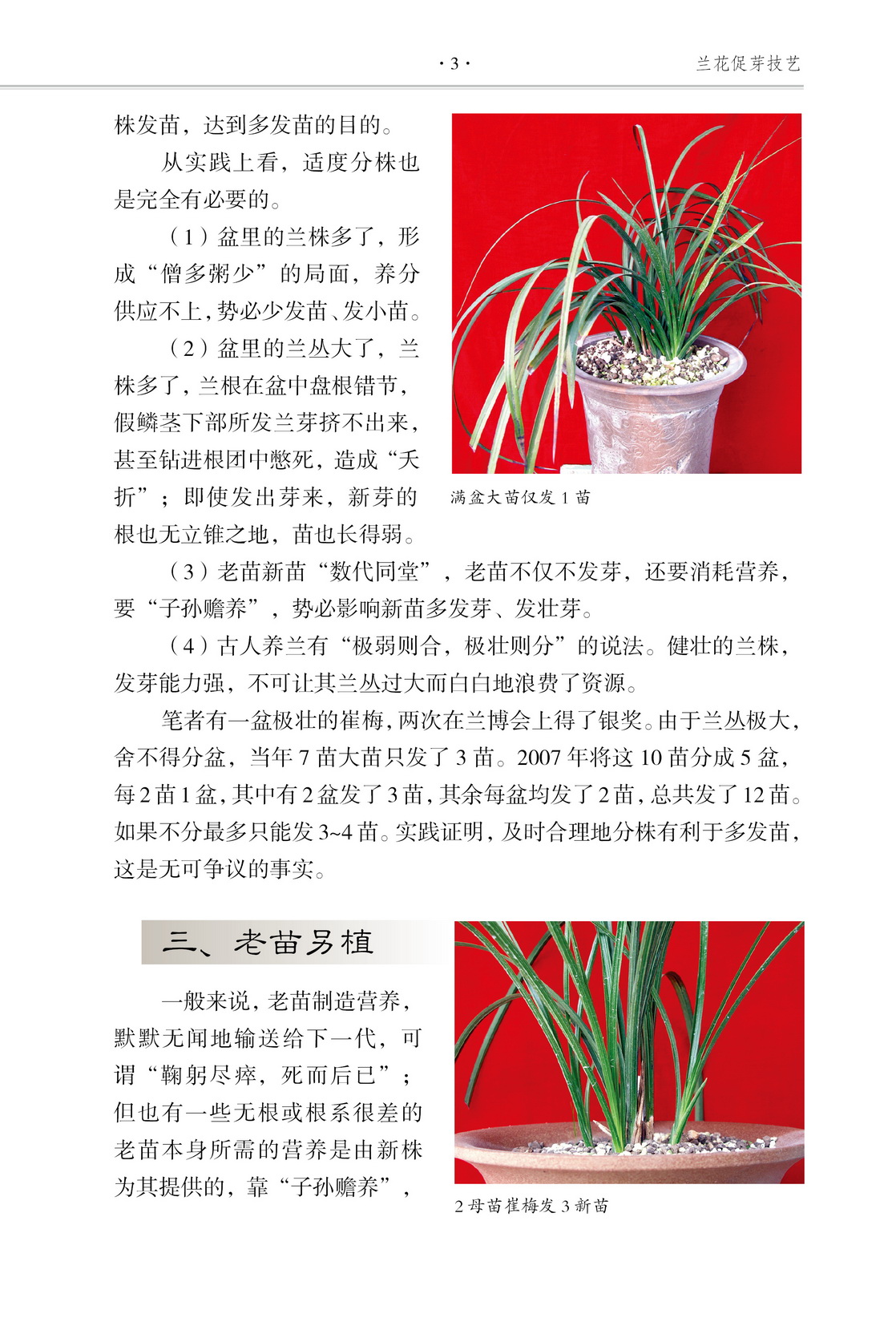 無論對于投資型養蘭者還是娛樂型養蘭者而言,如何讓蘭株多苗,這是養蘭的一個中心內容。然而要讓蘭花多長芽、長壯苗不是那么容易的事,它涉及養蘭的方方面面,例如:該用什么植料種?一天或幾天該澆幾次水?放在什么地方合適?等。一些老蘭人在長期的實踐中總結出了許多促芽的經驗,例如:適度分株、老草另植、扭傷球莖連接處、適當使用激素、摘花蕾等。這些經驗對于養蘭者特別是初學者有著重要的參考價值。本書以彩圖的形式介紹這些蘭花促芽壯苗的經驗。